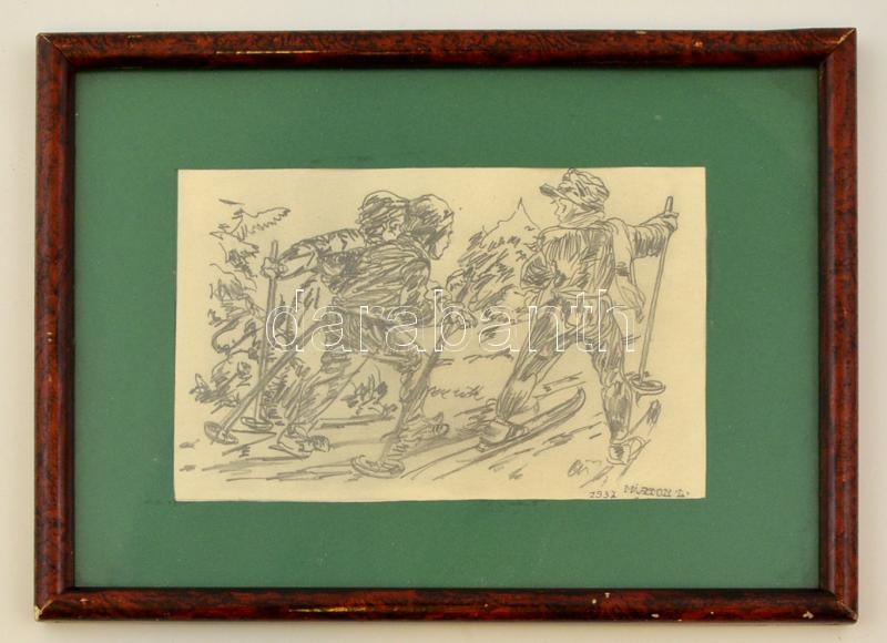 Márton Lajos (1891-1953): Síelők 1932, ceruza, papír, utólag jelzett, ...
