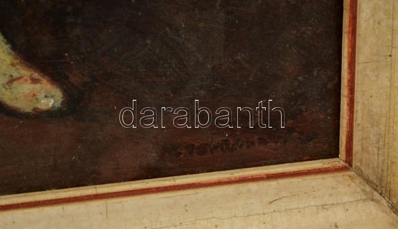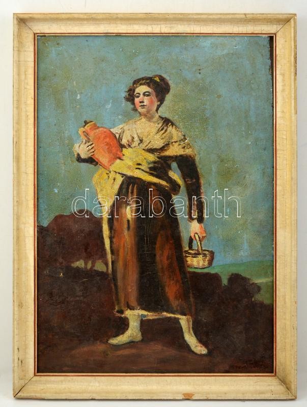 Olvashatatlan jelzéssel: Nő korsóval. Olaj, falemez, sérült, keretben,...