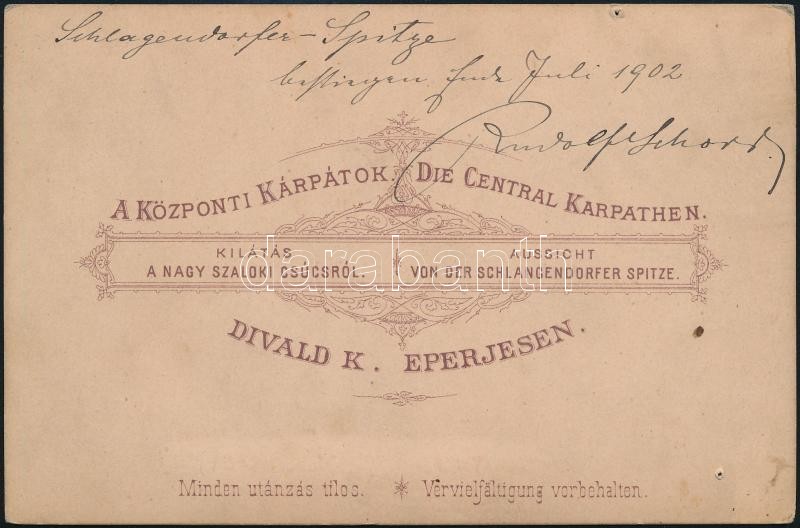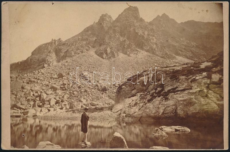 1902 Tátra, Nagyszalóki-csúcs, Divald Károly eperjesi műterméből, kartonra kasírozva, hátoldalán feliratozva, tűnyomokkal, 11x16 cm / The High-Tatra mountains, Divald photo, pinholes, 11x16 cm