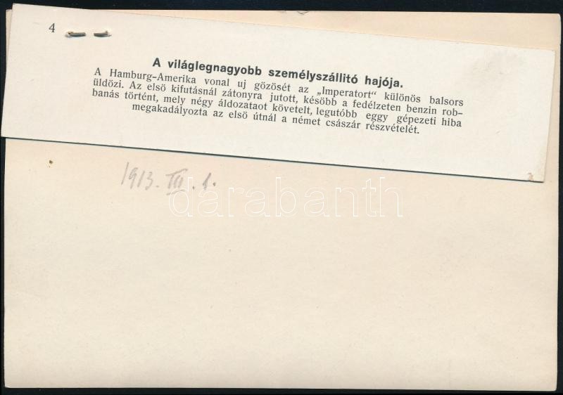 1913 Imperator a Hamburg-Amerika line hajója Korabeli sajtófotó, hozzá... https://www.darabanth.com/en/299-Online-auction/299.0/Other-collectibles/Photo~20/1913-Imperator-a-Hamburg-Amerika-line-hajoja-Korabeli-sajtofoto-hozzatuzott-szoveggel-1913~II1492265