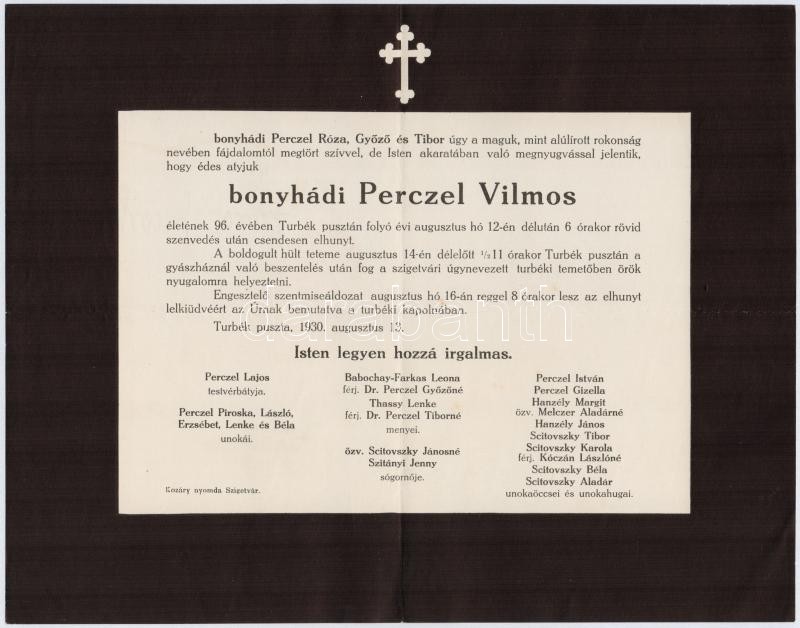 1930 Bonyhádi Perczel Vilmos (1834-1930) halálozási értesítője, Turbék-puszta (Baranya-megye), nagykéri Scitovszky, miskei és monostori Thassy, babocsai Babochay-Farkas rokonsággal.