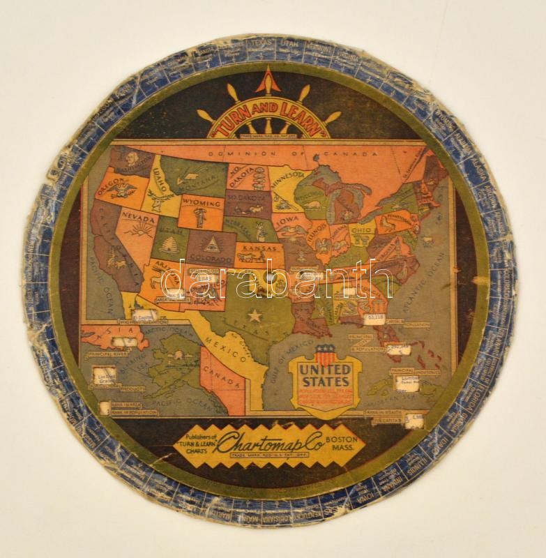 cca 1920-1930 "Turn and learn - USA" - Az Egyesült Államok államait és adatait ismertető forgatható korong