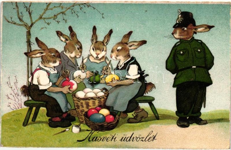Húsvéti üdvözlet / Easter greeting card with rabbits painting eggs, li...