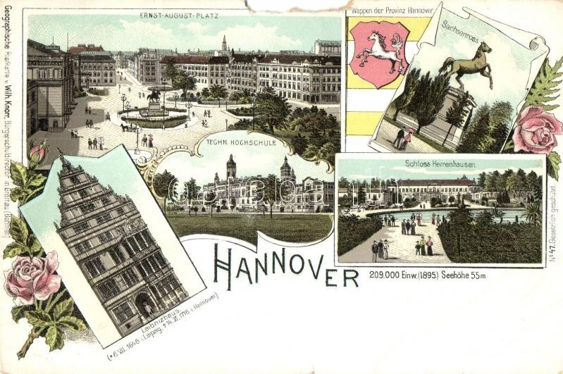 Hannover, Leibnizhaus, Schloss Herrenhausen, Sachsenross, Techn. Hochschule, Wappen, Ernst-August-Platz / school, castle, monument, coat of arms. Geographische Postkarte v. Wilh. Knorr. Floral, litho (b)