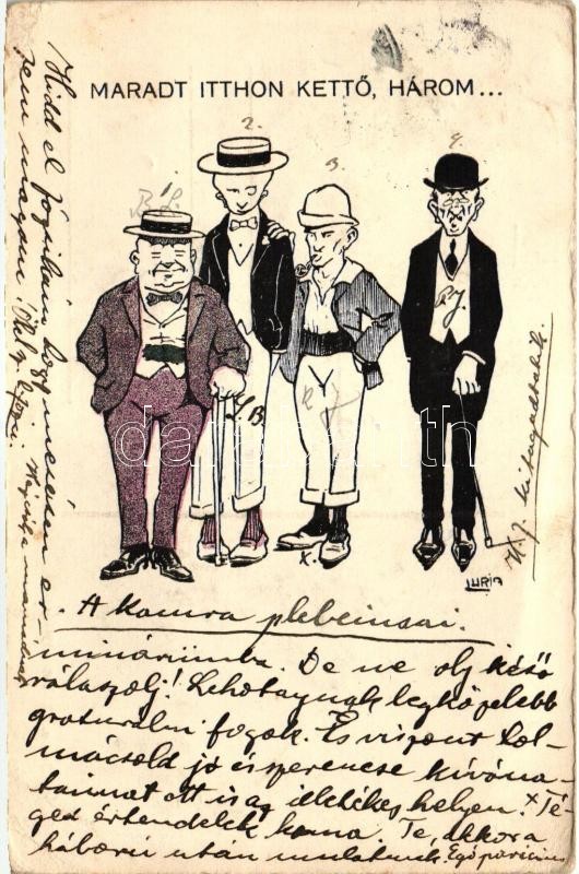 'Maradt itthon kettő, három' humorous art postcard, s: Luria...