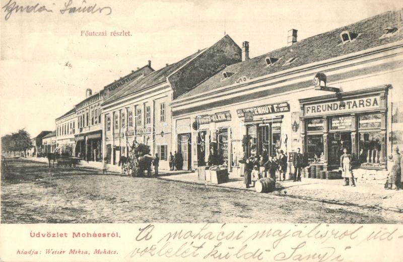 Mohács, Fő utca, Freund és Társa, Herrnhut F., Fuchs-Klein, Witt József, Báder Lipót üzletei, Weiser Miksa kiadása (EK)