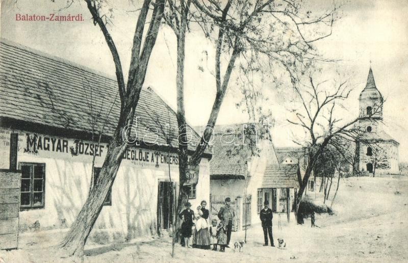 Zamárdi, Balatonzamárdi; Magyar József Vendéglője a Tengerszemhez, utcakép templommal (EK)