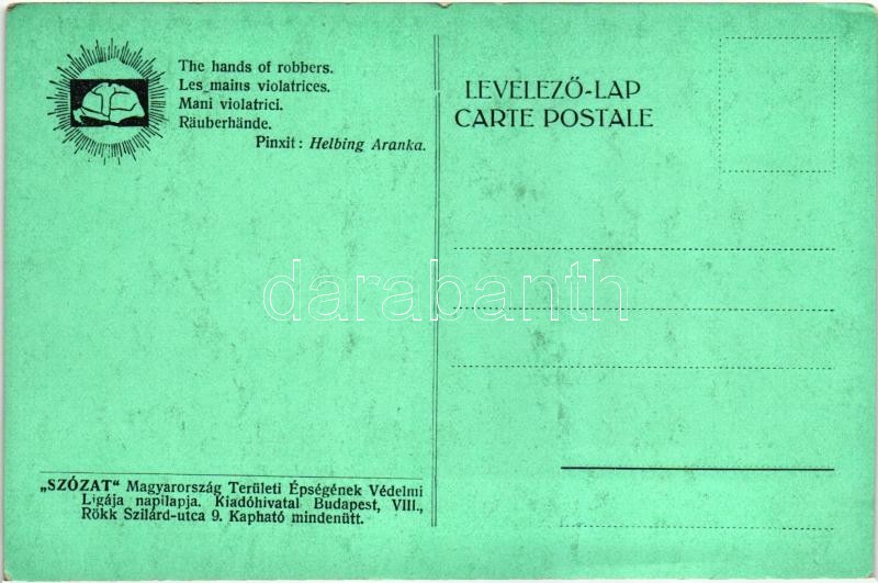 A rablók kezei. Kiadja a Szózat Magyarország Területi Épségének Védelm... https://www.darabanth.com/en/299-Online-auction/299.0/Postcards/Irredenta~500074/A-rablok-kezei-Kiadja-a-Szozat-Magyarorszag-Teruleti-Epsegenek-Vedelmi-Ligajanak-napilapj~II1604346