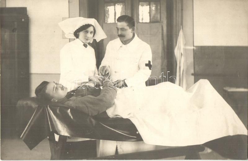Description: 1914 K.u.K. katonai műtőterem sebesült katonával, orvossal és nővérrel / Im Operationssaal / WWI K.u.K. military, injured soldier in the operating theater with doctor and nurse. photo