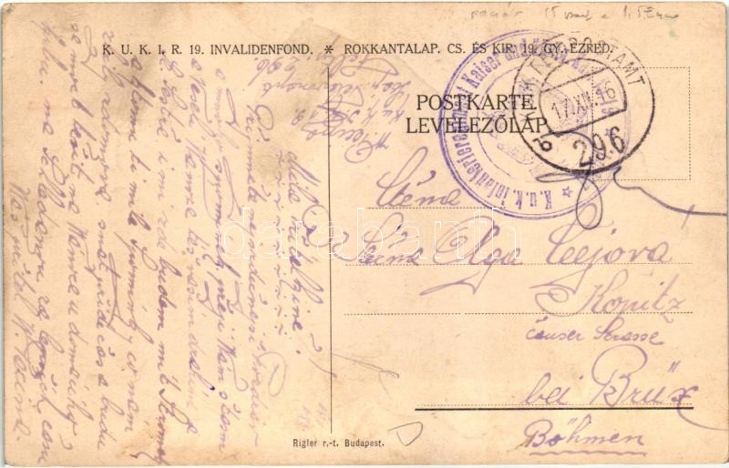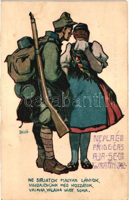 Description: Ne sírjatok magyar lányok, visszajövünk még hozzátok, valaha, valaha vagy soha. Rokkantalap Cs. és kir. 19. gyalogezred / WWI Invalidenfond K.u.K. Inf. Reg. 19. s: Biczó (EK)