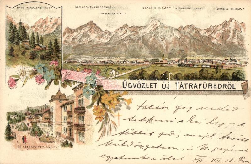1899 Újtátrafüred, Neu-Schmecks, Novy Smokovec; Nagy Tarpataki völgy, csúcsok / valley, mountain peaks. floral, litho (EK)