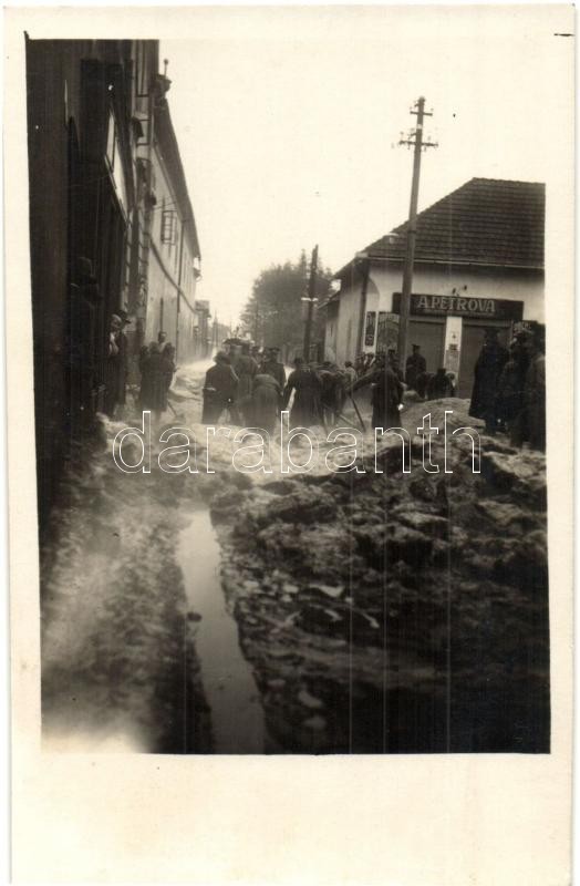 1930 Eperjes, Presov; utcakép a nagy jégeső után katonákkal, A. Petrov...