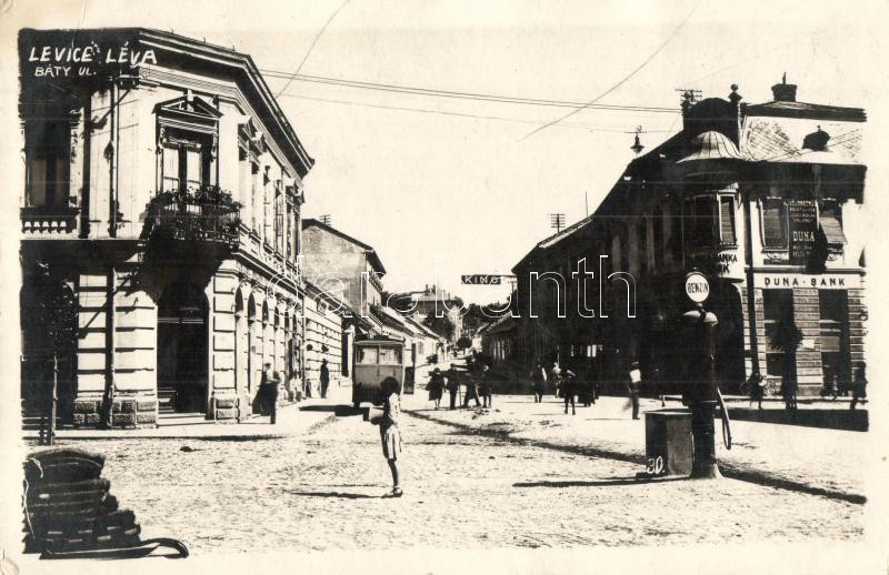 ~1920 Léva, Levice; Báty utca, mozi, Duna bank, benzinkút / ulica / street view with cinema, gast station and autobus