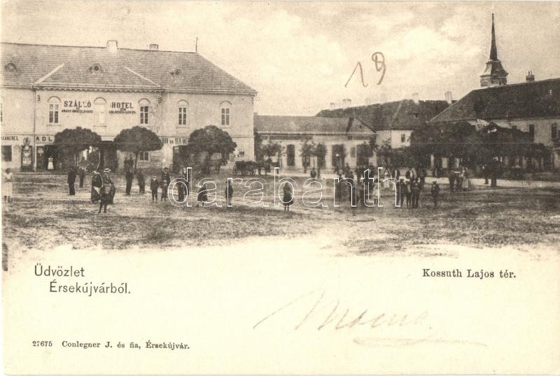 Érsekújvár, Nové Zamky; Kossuth Lajos tér, Szálló az Arany Oroszlánhoz, üzletek, Conlegner J. és fia kiadása / square, hotel, shops (EK)