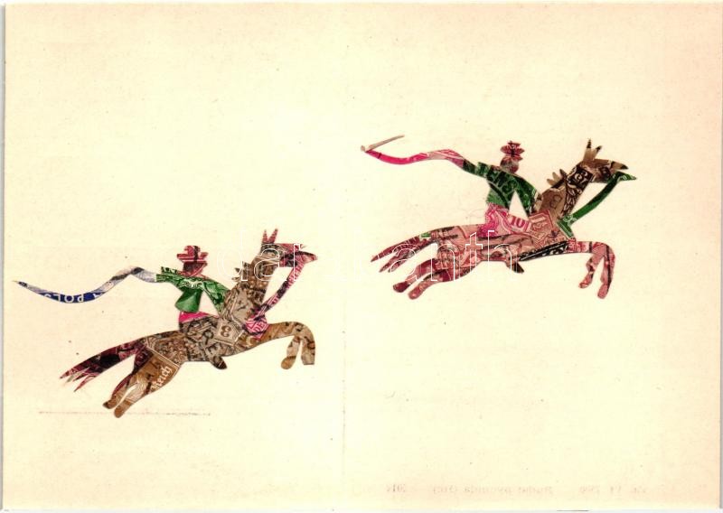 Lovassport. Bélyegekből kivágott és összeragasztott képeslap. Budai nyomda / Equestrian sports. Made out of stamps