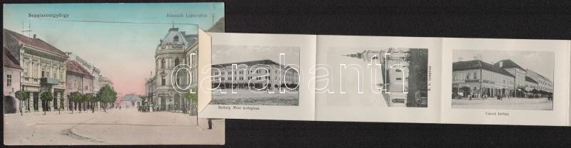 Description: Sepsiszentgyörgy, Sfantu Gheorghe; Kossuth Lajos utca, A Magyar jelzáloghitelbank székelyföldi képviselősége, Kossuth Kávéház, Fogolyán Endre és Kozma üzlete. Leporellolap belül szövő- és dohánygyárral / street view with cafe and shops, leporellocard with factories inside