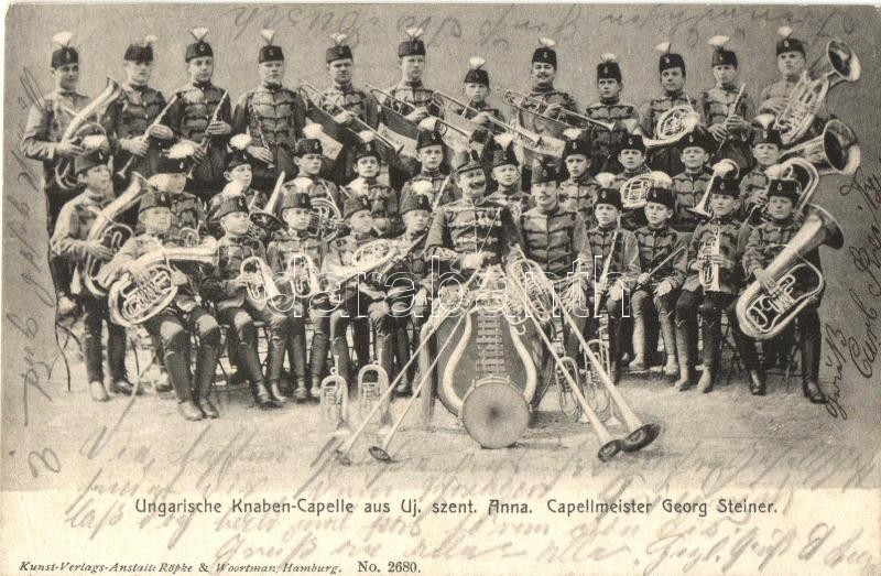 Description: Újszentanna, Santana; Ungarische Knaben-Capelle, Capellmeister Georg Steiner, Kunst-Verlags-Anstalt: Röpke & Woortman No. 2680. / Az újszentannai magyar fiúzenekar és karmestere / Hungarian boys music band and the conductor (Rb)