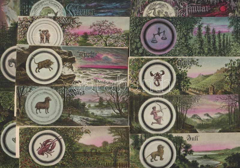 1900 Az állatöv jegyei, 12 db lap / Tierkreiszeichen, 12 versch. Karte...