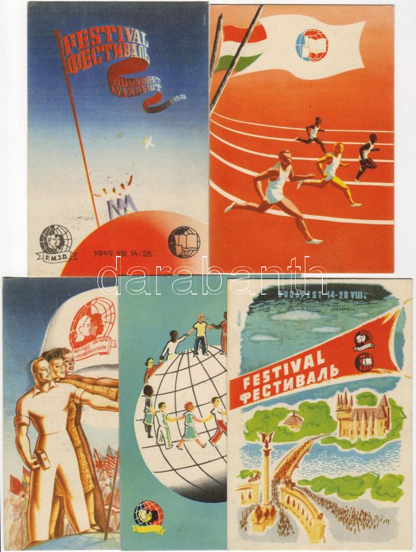 1949. Világifjúsági találkozó 5 klf képeslap, hátoldalukon bélyeggel é... https://www.darabanth.com/en/3-Major-auction/3.1/Thematic-postcards/~856/1949-Vilagifjusagi-talalkozo-5-klf-kepeslap-hatoldalukon-belyeggel-es-alkalmi-belyegzes~II60134