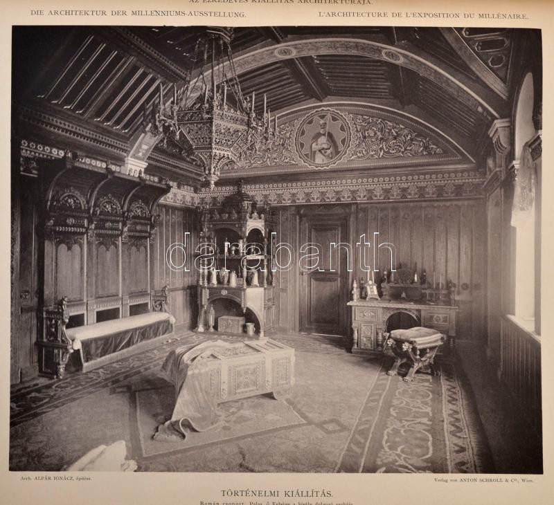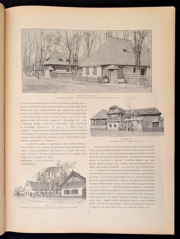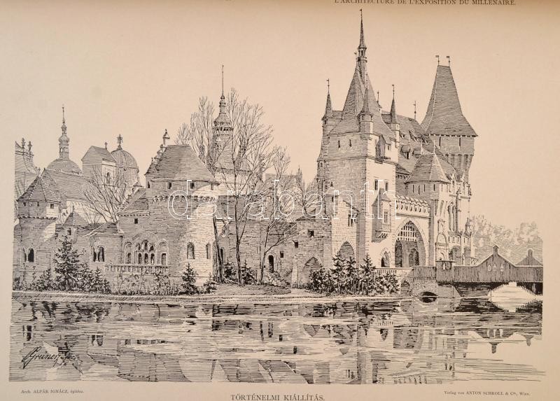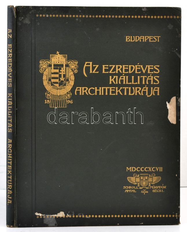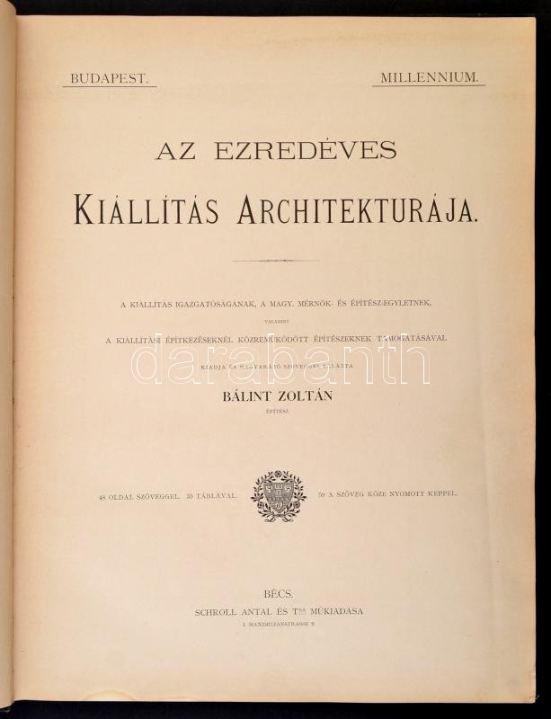 Bálint Zoltán: Az ezredéves kiállÃtás architektúrája. A kiállÃtás igazgatóságának, a Magy. Mérnök- és ÉpÃtész-Egyletnek, valamint a kiállÃtási épÃtkezéseknél közreműködött épÃtészeknek támogatásával kiadja és magyarázó szöveggel ellátta Bálint Zoltán épÃtész. Alpár Ignác elÅ‘szavával. Bécs, 1897, Schroll Antal és Tsa műkiadása, (Reisser Ch. és Werthner M.-ny.),1 t. (kiállÃtás helyszÃnrajza)+47+1 p.+35 t. (a kiállÃtás épületeinek fényképei és fametszetű rajzai.) Egyetlen kiadás. Kiadói dÃszesen aranyozott, vaknyomásos egészvászon-kötésben, kissé kopott, kissé foltos borÃtóval, kissé sérült gerinccel, kissé laza fűzéssel, kijáró elülsÅ‘ szennylappal, a 17-es táblán szakadással (a kép érintetlen), a 35-ös tábla szélén kis hiánnyal (a kép érintetlen) és a hátsó szennylap szélén kis hiánnyal.