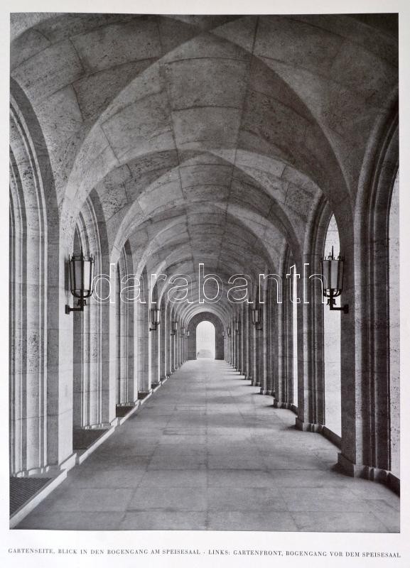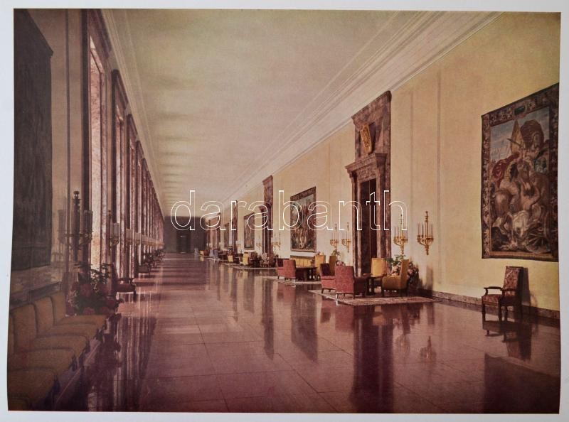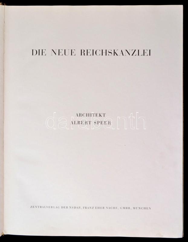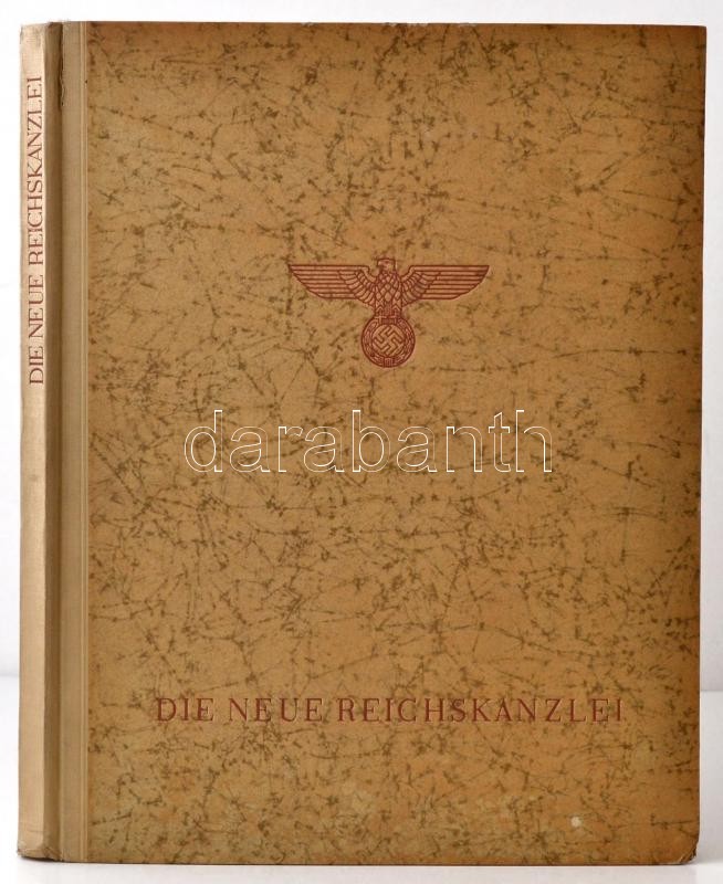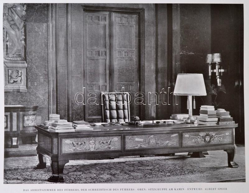 München, cca 1943. Zentralverlag der NSDAP Franz Eher Nachf. GmbH, Az Új Birodalmi Kancellária épületének bemutatása. 131p Gazdag képanyaggal, egy kihajtható terv melléklettel. Egyik sarkán kis gyűrődés. / 131p. with lots of illustrations and one fold-out plan. In half linen binding. Some crease on one corner.
