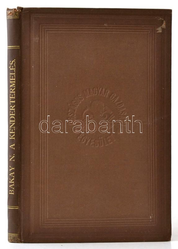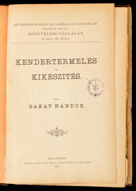 Bakay Nándor: Kendertermelés és kikészítés. Bp.,1892, Pesti Könyvnyomda Rt., IV+192+2 p. Kiadói aranyozott gerincű egészvászon-kötés, Halfer J.-kötés, egy kijáró lappal, laza kötéssel, néhány ceruzás aláhúzással, bejelöléssel. Ritka! Bakay Nándor (1833-1902) közgazdasági szakíró, polgári liberális közéleti személyiség, szegedi kötélgyáros. Apja műhelyében tanulta ki a kötélverés mesterségét, és az 1870-es évekre nemzetközi színvonalú, korszerű kenderfonó-, szövő- és kötélgyárat fejlesztett. A kendertermesztéssel és feldolgozással kapcsolatos kiadványait angol és francia szaklapok is közölték. Írásaiban és cikkeiben Szeged és a hazai ipar érdekeit képviselte.