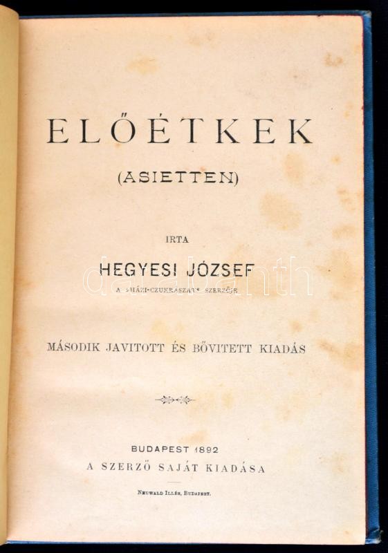 Hegyesi József: Előétkek (Asietten). Bp.,1892, Szerzői kiadás, (Newald Illés-ny.), 171+19 p. Második, javított és bővített kiadás. Kiadói egészvászon-kötés, Ruzitska Ármin-kötés, kopottas, foltos borítóval, de belül jó állapotban.