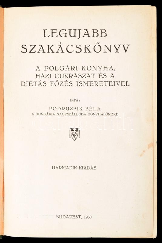 Description: Podruzsik Béla: Legújabb szakácskönyv. A polgári konyha, házi cukrászat és a diétás főzés ismereteivel. Bp.,1930, Szerzői kiadás,(Otthon-ny.),363 p. Harmadik Kiadás. Kiadói aranyozott egészvászon-kötés, kissé kopott borítóval.