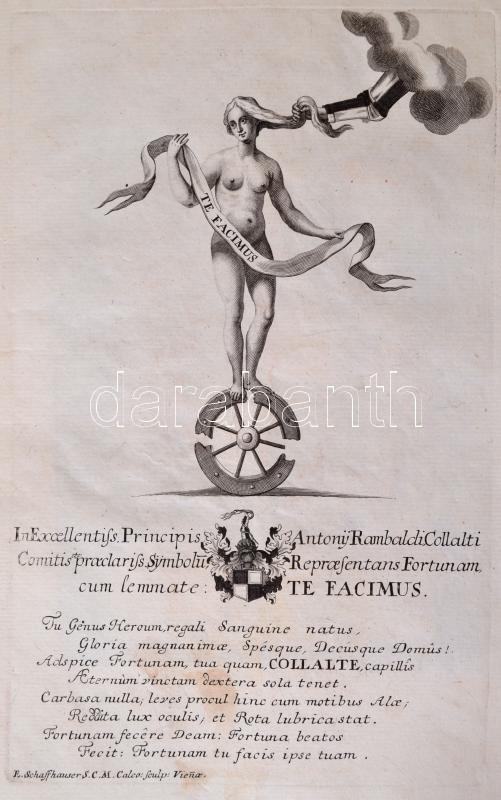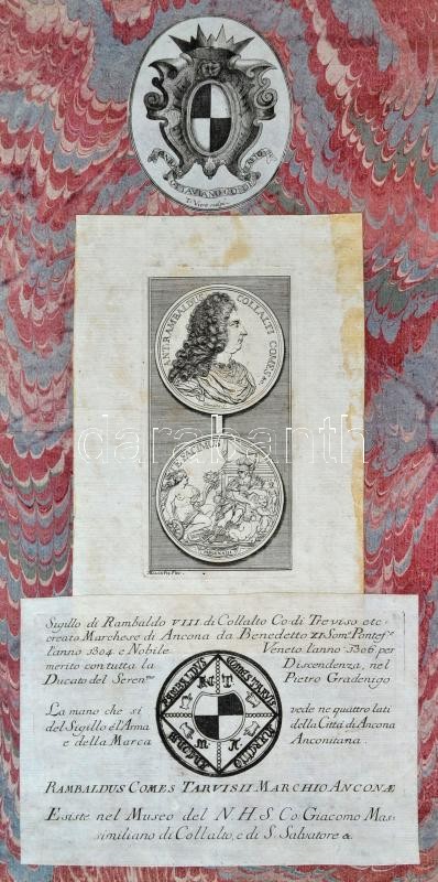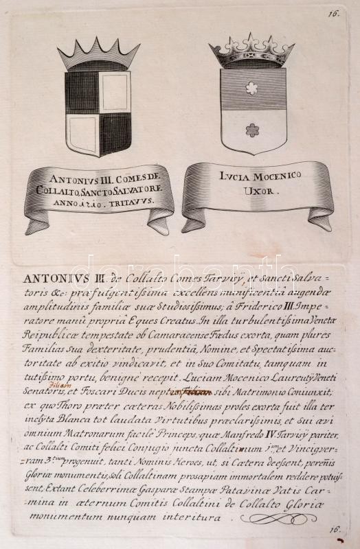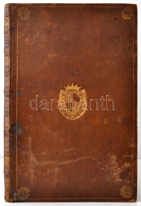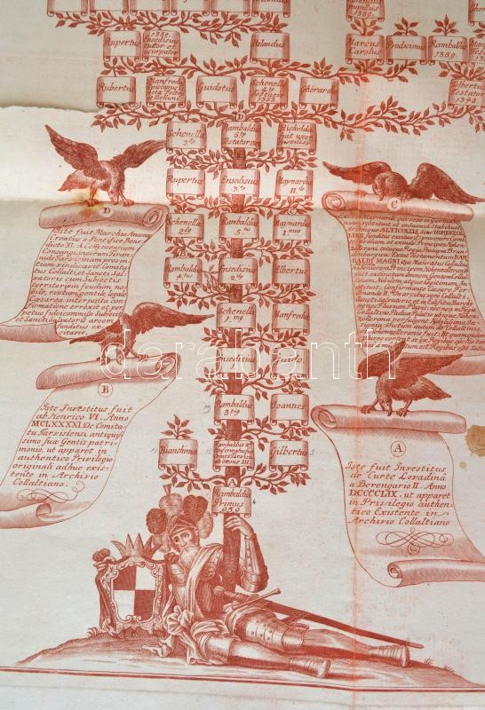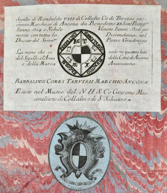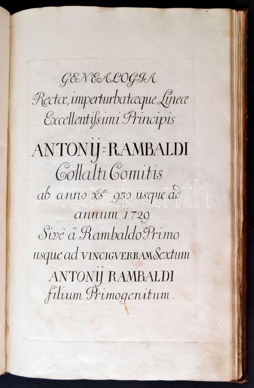 A Collalto-Rambaldi család genealógiája. Genealogia rectae, imperturbataeque lineae excellentissimi principis Antonii-Rambaldi Collalti Comitis ab anno Xsti 930 usque ad annum 1729 sive a Rambaldo Prima usque ad vinciguerram sextum Antonii Rambaldum filium primogenitum. [Vienna], 1729. wo. printer. 26 t (nagyméretű rézmetszetek címerpajzsok, szöveggel, 22 számozott 4 db részben kétoldalas számozatlan. 6 kiihajtható leszármazási tábla. (néhányon szakadás). Korabeli, aranyozott címeres egészbőr kötésben, aranyozott lapszélekkel. Ex librissel. A Collalto család a Treviso-i tartományban a mai napig megkerülhetetlen gazdasági sé politikai hatalom, a borkészítés legmagasabb fokát űzik évszázadok óta. Magyar vonatkozásuk is van, ugyanis a család két tagját az 1659. évi országgyűlés magyar hazafinak választotta. / Genealogy of the Collalt family rulers of Tarvisio in Italy. Folio, large folding engraved portrait, engraved title, twenty-two numbered engraved leaves, a further four engraved leaves/plates and six large folding engraved pedigrees, With ex libris. In gold-printed full leather binding. 26x40 cm