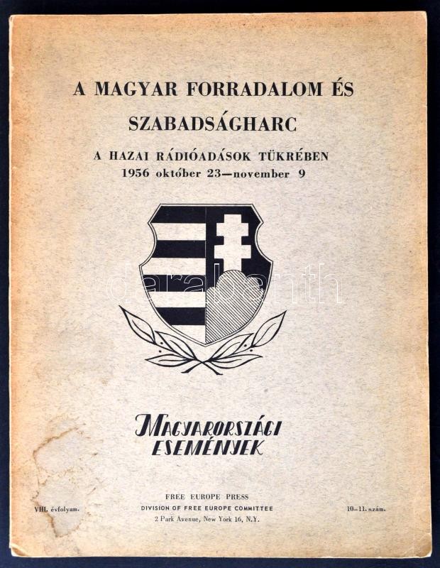 Description: A magyar forradalom és szabadságharc a hazai rádióadások tükrében 1956. október 23. - november 9. VIII. évfolyam 10-11. szám. New York, é.n., Free Europe Press. Kiadói papírkötés, gerincnél sérült, kopottas állapotban.