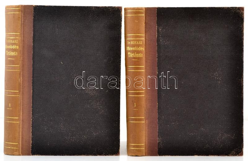 Dr. Bihari Péter: Általános és hazai művelődéstörténet. I-II. kötet. I. kötet: Történelem előtti kor. Ókor. Középkor. II. kötet: Újkor. Bp.,1884, Pfeifer Ferdinánd, XVIII+2+606+VII+1+679 p. Korabeli félvászon-kötésben, márványozott lapélekkel, kissé kopott borítóval, egyébként jó állapotban. Komlóssy Arthur (1848-1910) Debrecen város főjegyzője, és polgármester helyettesének névbejegyzéseivel.