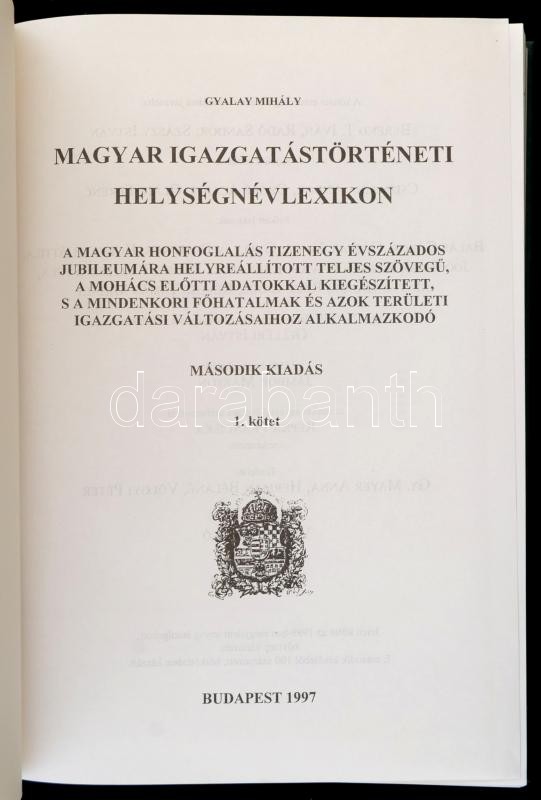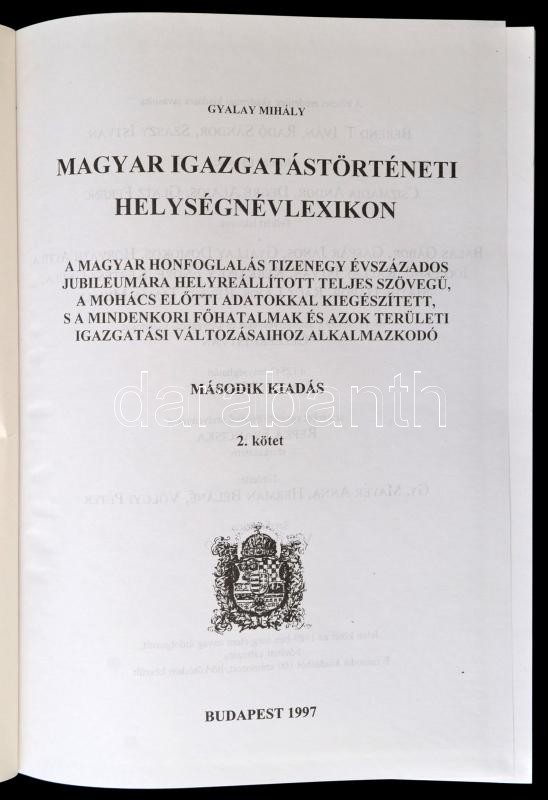Gyalay Mihály: Magyar igazgatástörténeti helységnévlexikon I-II. A magyar honfoglalás tizenegy évszázados jubileumára helyreállÃtott teljes szövegű, a Mohács elÅ‘tti adatokkal kiegészÃtett, s a mindenkori fÅ‘hatalmak és azok területi igazgatási változásaihoz alkalmazkodó második kiadás. I-II. kötet [+ térképkötet].