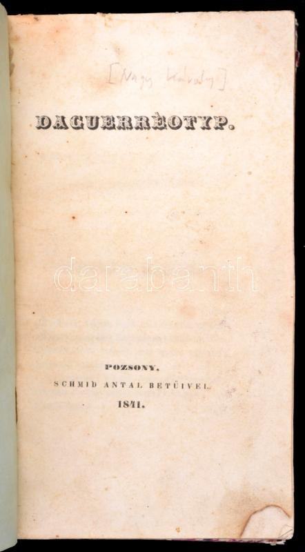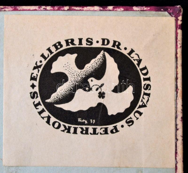 [Nagy Károly]: Daguerréotyp. Pozsony, 1841, Schmid Antal, 284+4 p. Egyetlen kiadás. Átkötött félvászon-kötés, kopott borítóval, kissé foltos lapszélekkel, hibás lapszámozással (284/278,283/277.), ex libris-szel. Fery Antal (1908-1944): Ex libris Dr. Ladislaus Petrikovits. Fametszet, papír, jelzett, 7x6 cm. Dr. Petrikovits László (1901-1972) - Szerencsi körorvos, gyűjtő, a Szerencsi Helytörténeti Múzeum alapítója.