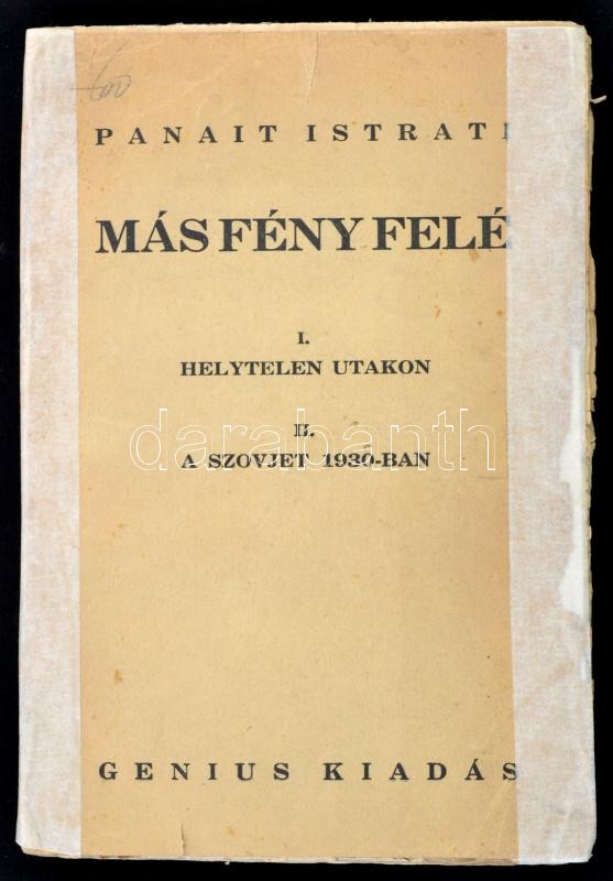 Description: Panait Istrati: Más fény felé. I. Helytelen utakon. Fordította: Dr. Supka Géza. II. A Szovjet 1930-ban. Fordította: Braun Róbert. (Egy kötetben.) Bp.,é.n.[1931],Genius, (Kunossy-ny.),204+2+2+156 p. Kiadói papírkötésben, javított borítóval. Ritka! A könyv szerepel az 1945-ben betiltott könyvek listáján.