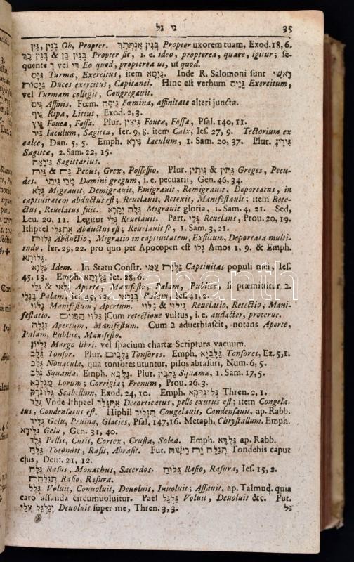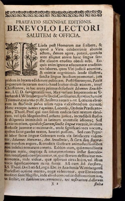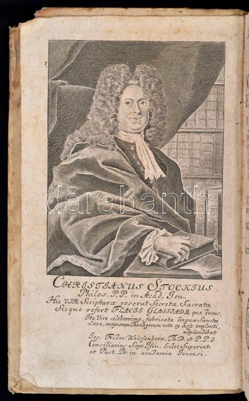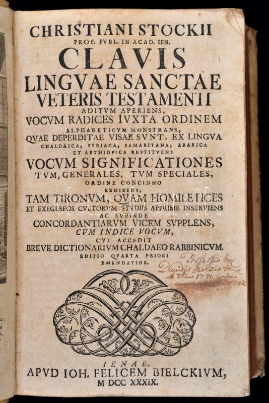 Christiani Stockii (Christian Stock (1672-1733): Clavis linguae sanctae Veteris Testamentii: aditum aperiens, vocum radices juxta ordinem alphabeticum monstrans, quae deperditae visae sunt, ex lingua chaldaica, syriaca, samaritana, arabica et aethiopica restituens; vocum significationes tum generales, tum speciales, ordine concinno exhibens; tam tironum, quam homiletices et exegeseos cultorum studiis apprime inserviens ac subinde concordantiarum vicem supplens; cum indice vocum, cui accedit breve dictionarum chaldaeo-rabbinicum. (A gerincen: Stockii Lexicon Hebraicum.) Ienae(Jena), 1739, Ioh. Felicem Bielckium, 1 t.+6+1198+50 p. Editio quarta priori emendatior. (Negyedik, javított kiadás.) Héber és latin nyelven. Korabeli pergamen kötésben, festett lapélekkel, modern aranyozott gerincű karton védőtokban, a borítón foltos, kopásnyomok, a két felső sarkán kisebb, és nagyobb sérüléssel. / Christiani Stockii (Christian Stock (1672-1733): Clavis linguae sanctae Veteris Testamentii: aditum aperiens, vocum radices juxta ordinem alphabeticum monstrans, quae deperditae visae sunt, ex lingua chaldaica, syriaca, samaritana, arabica et aethiopica restituens; vocum significationes tum generales, tum speciales, ordine concinno exhibens; tam tironum, quam homiletices et exegeseos cultorum studiis apprime inserviens ac subinde concordantiarum vicem supplens; cum indice vocum, cui accedit breve dictionarum chaldaeo-rabbinicum. (On the spine: Stockii Lexicon Hebraicum.) Ienae(Jena), 1739, Ioh. Felicem Bielckium, 1 t.+6+1198+50 p. Editio quarta priori emendatior. Fourth, corrected edition. Contemporary parchment-binding, with colored page edges, in modern box, with spotty and worn cover, with damages on the upper corner, in Hebrew and Latin languages.