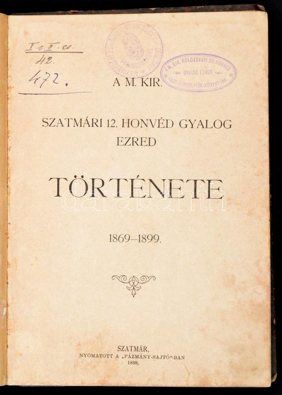 A m. kir. szatmári 12. honvéd gyalogezred története 1869-1899. Szatmár... https://www.darabanth.com/en/30-Major-auction/30.1/Books/Books-Military~12156/A-m-kir-szatmari-12-honved-gyalogezred-tortenete-1869-1899-Szatmar-1899-Pazmany-sajto~II1842457