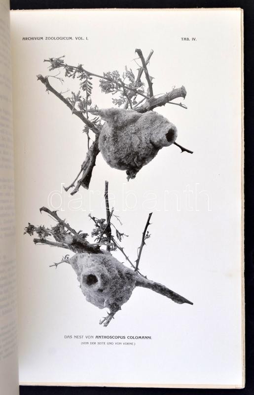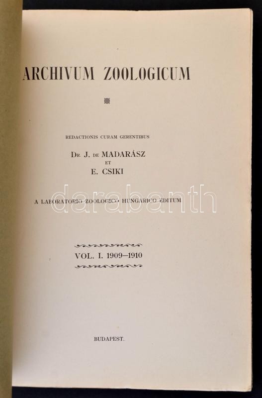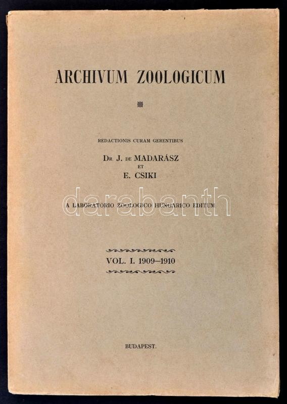 Archivum Zoologicum. Vol. I. 1909-1910. Szerk.: Dr. Madarász Gyula.- Csiki Ernő. Hazai Zoológiai Laboratorium kiadása. Bp.,1910, Horyánszky Viktor-ny., 6+203 p.+VII t. (A táblák előtt hártyapapírral.) Szövegközti illusztrációkkal. Nagyrészt német, részben latin, angol és francia nyelven. Kiadói papírkötés, több nyelven, jó állapotban. Több kötet nem jelent meg. Ritka!