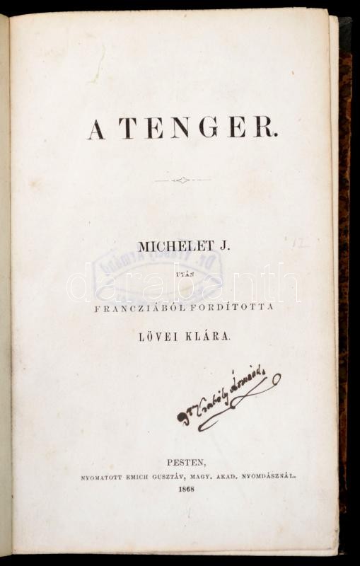 J(ules) Michelet: A tenger. Fordította: Lövei Klára. Pest, 1868, Emich Gusztáv, 2 t.(Michelet levélének másolata, Michelet litografált arcképe (címkép))+4+368+1 p. Egyetlen kiadás. Átkötött félvászon-kötés, Dr. Vrabély Ármánd (1864-1939) bölcseleti doktor, író, újságíró, minisztériumi segédtitkár saját kezű tulajdonosi névbejegyzésével, és tulajdonosi névbélyegzőjével.
