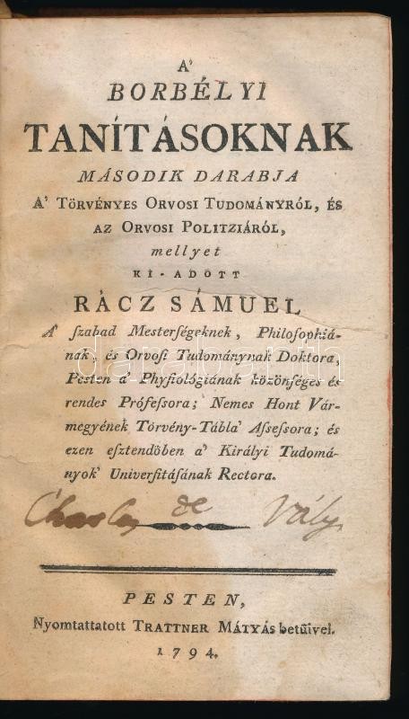 Rácz Sámuel: A' borbélyi tanításoknak második darabja A Törvényes Orvosi Tudományról, és az Orvosi Politziáról, mellyet ki-adott - -. Pesten, 1794. Trattner. 10 sztl.lev. 383 p. 12 sztl.lev. Korabeli aranyozott félbőr-kötésben. Tulajdonosi bejegyzéssel, Hátsó előzéklapján egy kézzel írott recepttel. Rácz Sámuel a magyar tankönyvirodalom megalapítója, itt szereplő munkáját tankönyvként írta sebészhallgatók részére. A mű első kötetében a bonctant, gyógyszertant, fekélyeket, daganatokat és a szembetegségeket tárgyalja, de említést érdemel a szülészeti része is. A második kötetben ,,Az egésség dolgában kiadott királyi rendelések"-et ismerteti, vagyis az egészségügyi közigazgatásra vobnatkozó helaytartósági rendeleteket sorolja fel. Rikta mű.