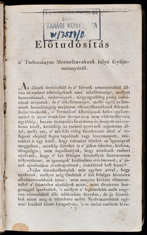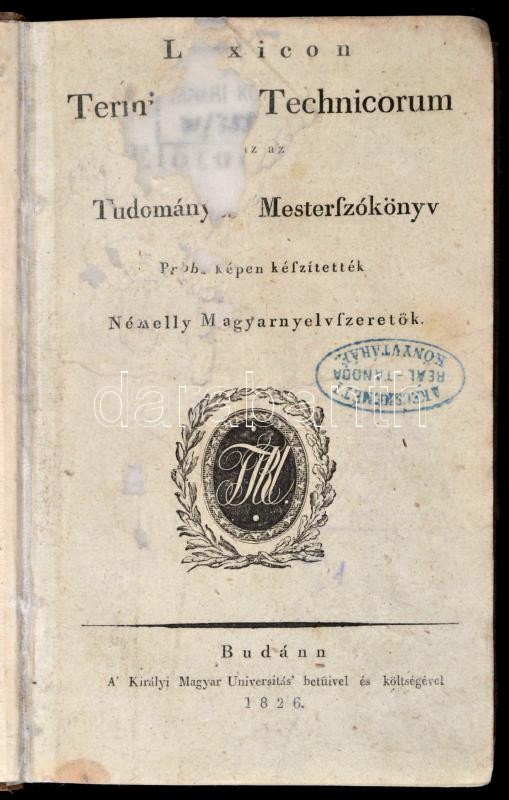 Verseghy Ferenc: Lexicon Terminorum Technicorum az az Tudományos Mesterszókönyv. Próbaképpen készítették Némelly Magyarnyelvszeretők. Budánn, 1826. Királyi Magyar Universitás. XXIV. 520 l. Címlap pausszal javítva. Korabeli egészvászon kötésben.