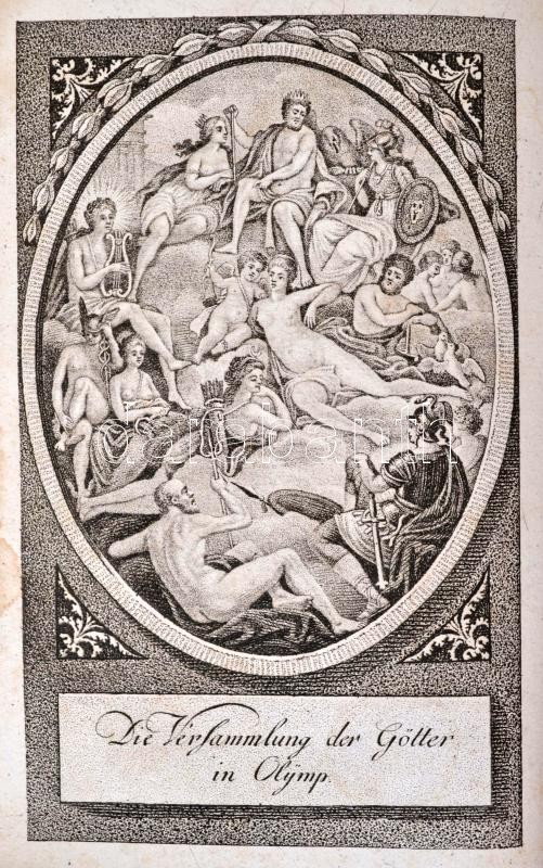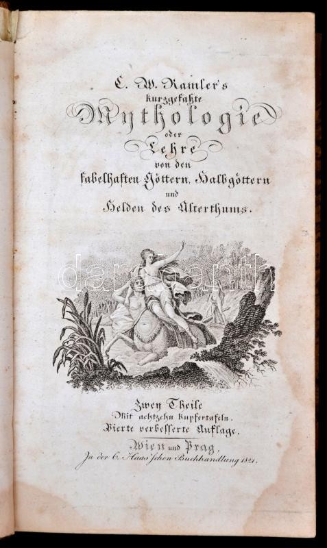K. W. Hamler's kurzgefaßte Mythologie oder Lehre von den fabelhaften Göttern, Halbgöttern und Helden des Alterthums. Wien-Prag, 1821, G. Haas, 436 p.+1 t. (rézmetszetekkel.) Negyedik kiadás. Német nyelven. Félbőr-kötésben, kopott borítóval, sérült, javított gerinccel, a címképen hiánnyal, egy tábla hiányzik, foltos./Leather-binding, with worn cover, damaged, repaired spine, with damaged title picture, one illustration lost, in German language.