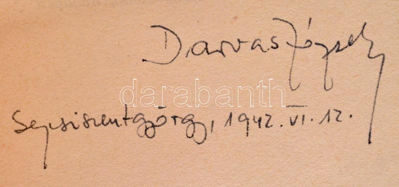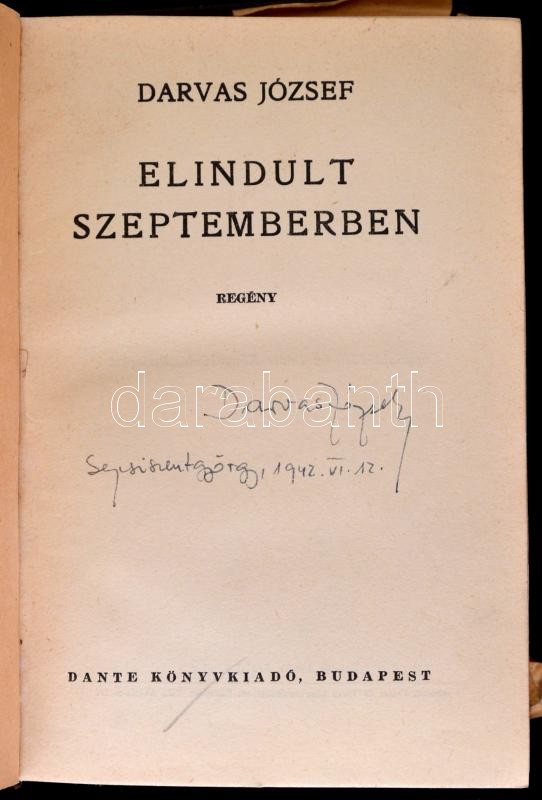 Description: Darvas József: Elindult Szeptemberben. Bp.,1940, Dante. Kiadói félvászon-kötés, kiadói szakadt, hiányos papír védőborítóban, a gerincen kis sérüléssel. Első kiadás. A szerző által aláírt, dátumozva, (Sepsiszentgyörgy, 1942. VI. 12.)