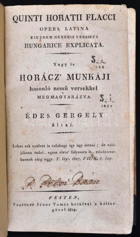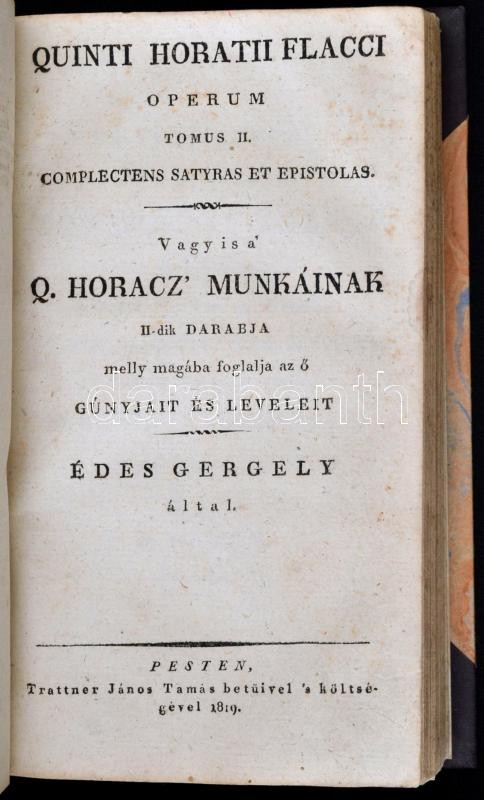 - Quinti Horatii Flacci Operum tomus II. complectens satyras et epistolas. Vagy is a' Q. Horacz'. munkáinak II-ik darabja melly magába foglalja az ő gúnyjait és leveleit. Édes Gergely által. [I-II. rész, egybekötve.] Pesten, 1819. Trattner János Tamás betűivel 's költségével. XV + [16]-231 + [1] p.; 264 p. Modern, félvászon kötésben. Jó állapotban.