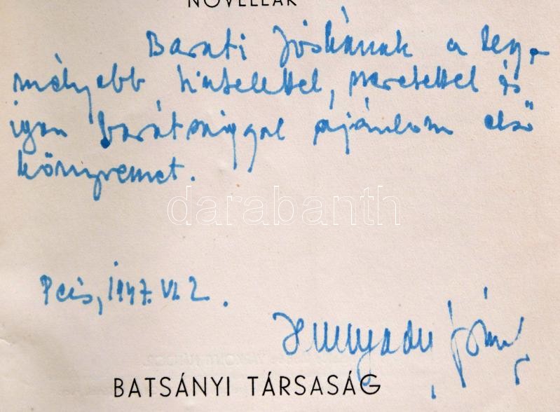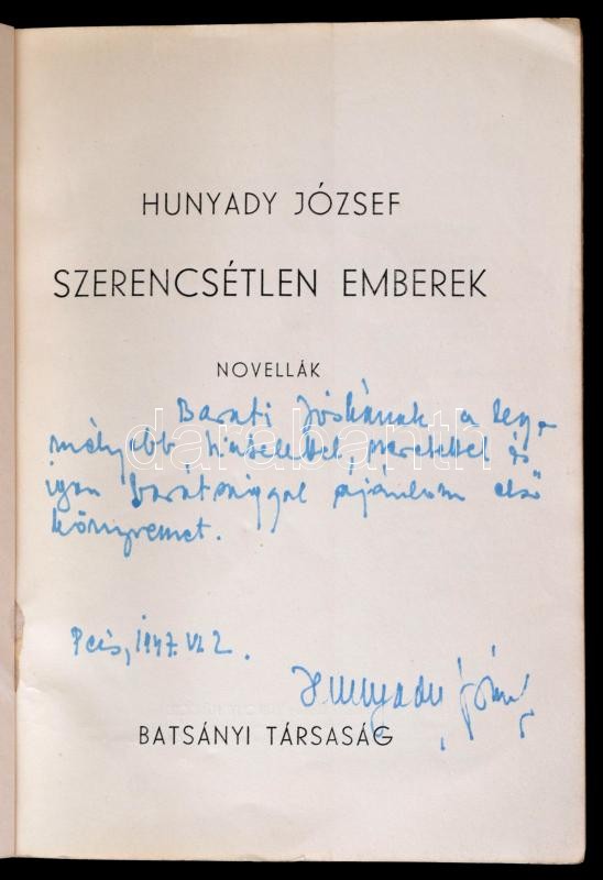 Description: Hunyady József: Szerencsétlen emberek. Novellák. A Batsányi Társaság Könyvtára. Szépirodalmi sorozat. 3. (Pécs,1947),Batsányi Társaság,(Kultúra-ny.),62+2 p. Kiadói papírkötés. Első kiadás. A szerző által dedikált.