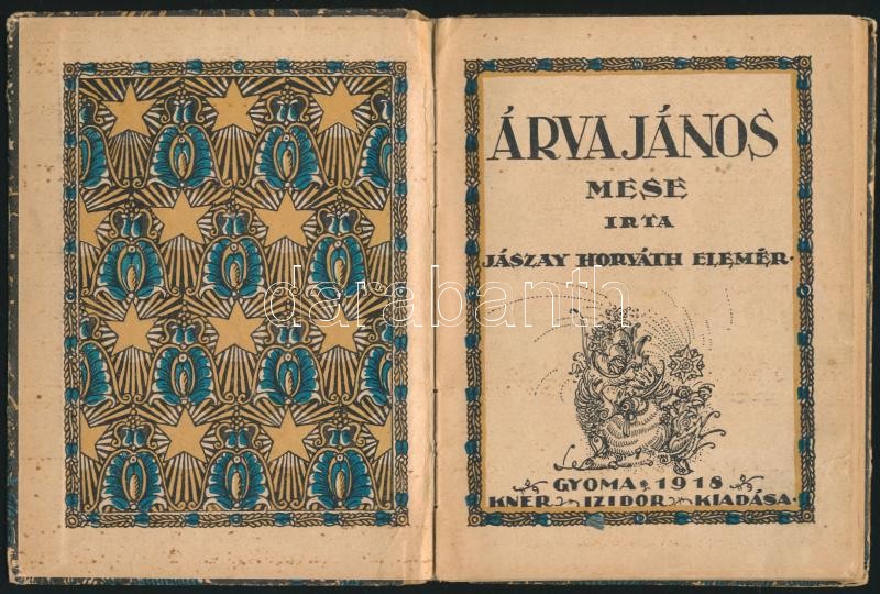Description: Jászai-Horváth: Árva János. Mese. Lapszámozáson belül Örkényi István(1886-1949) nyolc egészoldalas, színes illusztrációjával. Gyoma, 1918, Kner Izidor, 27+1 p. Kiadói Örkényi István által tervezett, színes, illusztrált félvászon-kötésben, kopott borítóval.