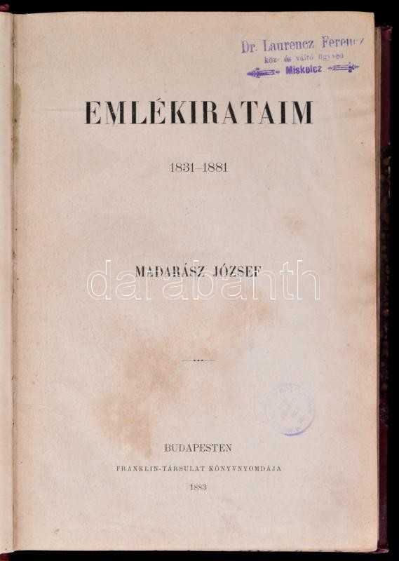 https://www.darabanth.com/en/30-Major-auction/30.1/Books/Books-Other-rarities~12169/Madarasz-Jozsef-Emlekirataim-1831-1881-Bp-1883-Franklin-528p-Felvaszon-kotesben~II1860905