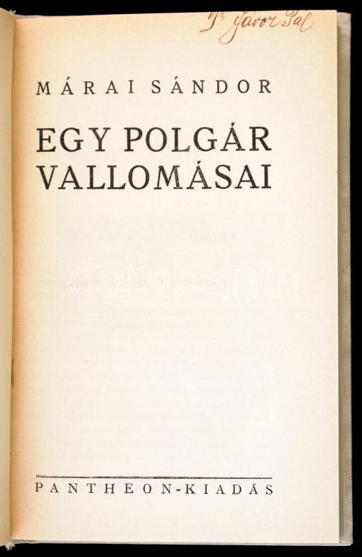Description: Márai Sándor: Egy polgár vallomásai. Bp.,[1934], Pantheon,(Tolnai-ny.) 315+4 p. Átkötött egészvászon-kötés. Első, cenzúrázatlan kiadás. Jávor Pál aláírásával.