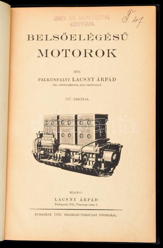 Falkusfalvi Lacsny Árpád: Belsőelégésű motorok. Bp.,1933, Lacsny Árpád, (Franklin-ny.) Kiadói egészvászon-kötés, intézményi bélyegzővel.