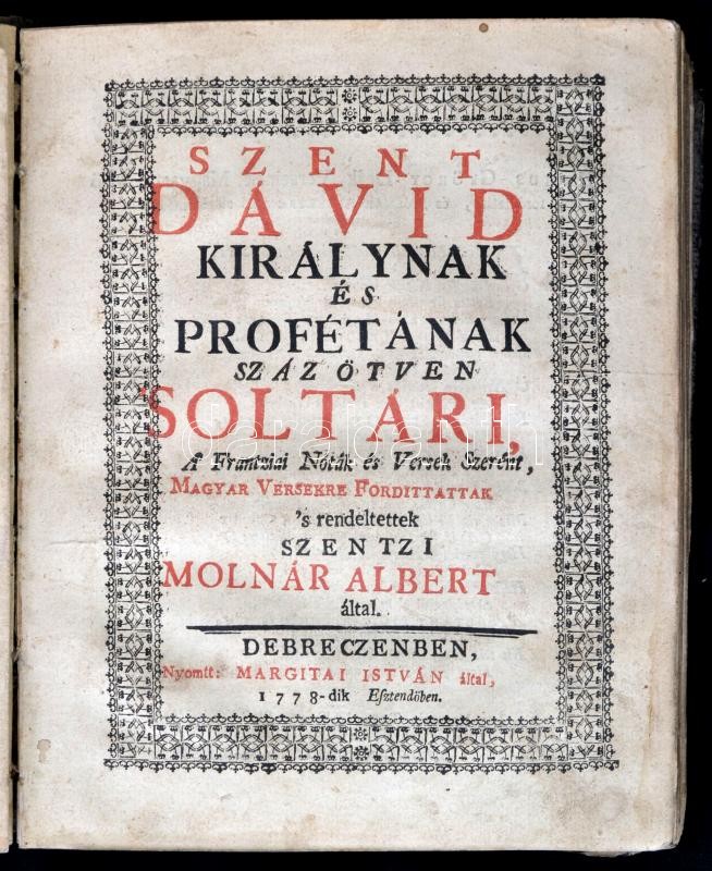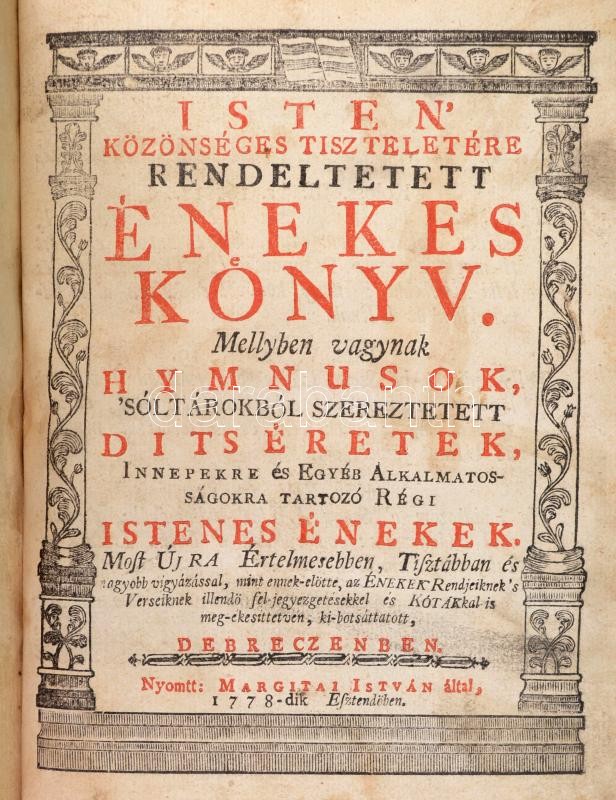 Isten közönséges tiszteletére rendeltetett énekes könyv. Mellyben vagynak hymnusok, 'sóltárokból szereztetett ditséretek, innepekre és egy alkalmatosságokra tartozó régi istenes énekek.+Ima a halotti tanítás előtt. Későbbi kézírásos szöveg, bekötve az első rész 482-483. oldala között, 4 levélen.+Szent Dávid királynak és profétának száz ötven 'soltári, a frantziai nóták és versek szerént, magyar versekre fordíttattak 's rendeltettek Szenzi Molnár Albert által. Debrecen, 1778, Margitai István, 484+14 p.+4 sztl. lev.+4+277+7 p. Korabeli aranyozott egészbőr-kötés, a borító hátoldalán 1780-as évszámmal, kopott borítóval, a borító sarkai sérültek, a gerinc kopott, kissé sérült, foltos, két lap kijár, a szennylapokon bejegyzésekkel ugyan attól a személytől, (1816-os évszámmal az egyik bejegyzésnél.