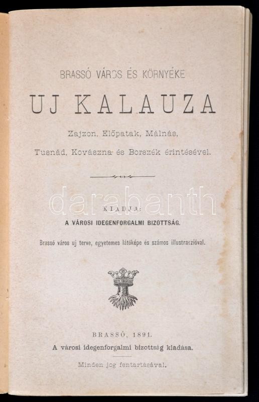 Brassó város és környéke új kalauza. Zajzon, Előpatak, Málnás, Tusnád, Kovászna, és Borszék érintésével. Brassó, 1891, Városi Idegenforgalmi Bizottság, 43+1+60 p.+XVII t. (Egészoldalas fekete-fehér fotók.) Korabeli reklámokkal. Kiadói papírkötésben, kissé kopott borítóval, az elülső címlap belsején és egy lapszélén folttal, hiányzó térkép melléklettel./ New Guide of Brasov (Kronstad/Brassó) and surroundings. Zizin, Vâlcele, Tusnad Sat, Covasna, Borsec. Brasov, 1891, Muncipial Tourist Office, 43+1+60 p.+XVII t. (With full pages black and white photographs.) With adds. In Hungarian language. Paperbinding, with worn cover, with some spotties, without map.